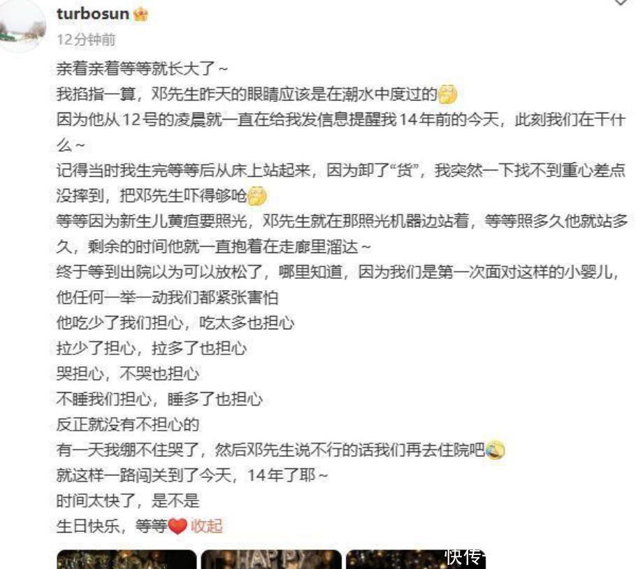 孙俪也发了一篇长文,回忆了儿子出生时的点点滴滴,她说等等刚出生时,她因为重心不稳差点摔倒,把邓超吓得不轻,孩子因为新生儿黄疸需要照光,邓超就整夜守在旁边。